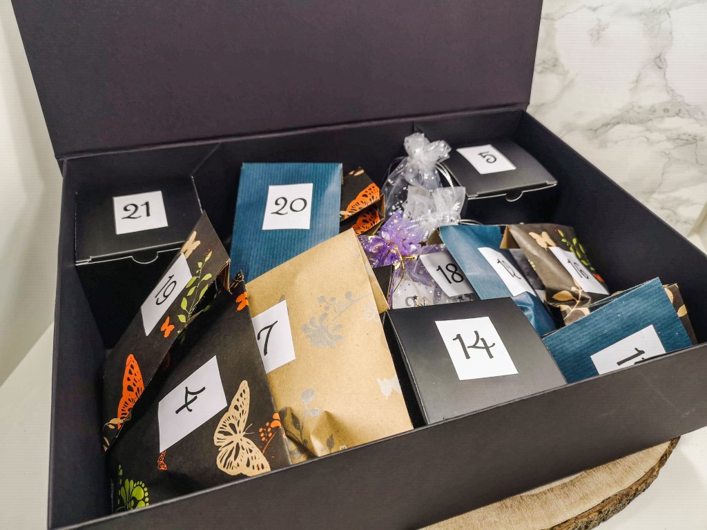 Wel, ik maakte een adventskalender met kristallen. Persoonlijk vind ik kristallen prachtig. Echte stukjes magie uit de aarde. Hoe tof zou het zijn om elke dag tot en met kerst een cadeautje met zo’n uniek stukje aarde te mogen openen?!