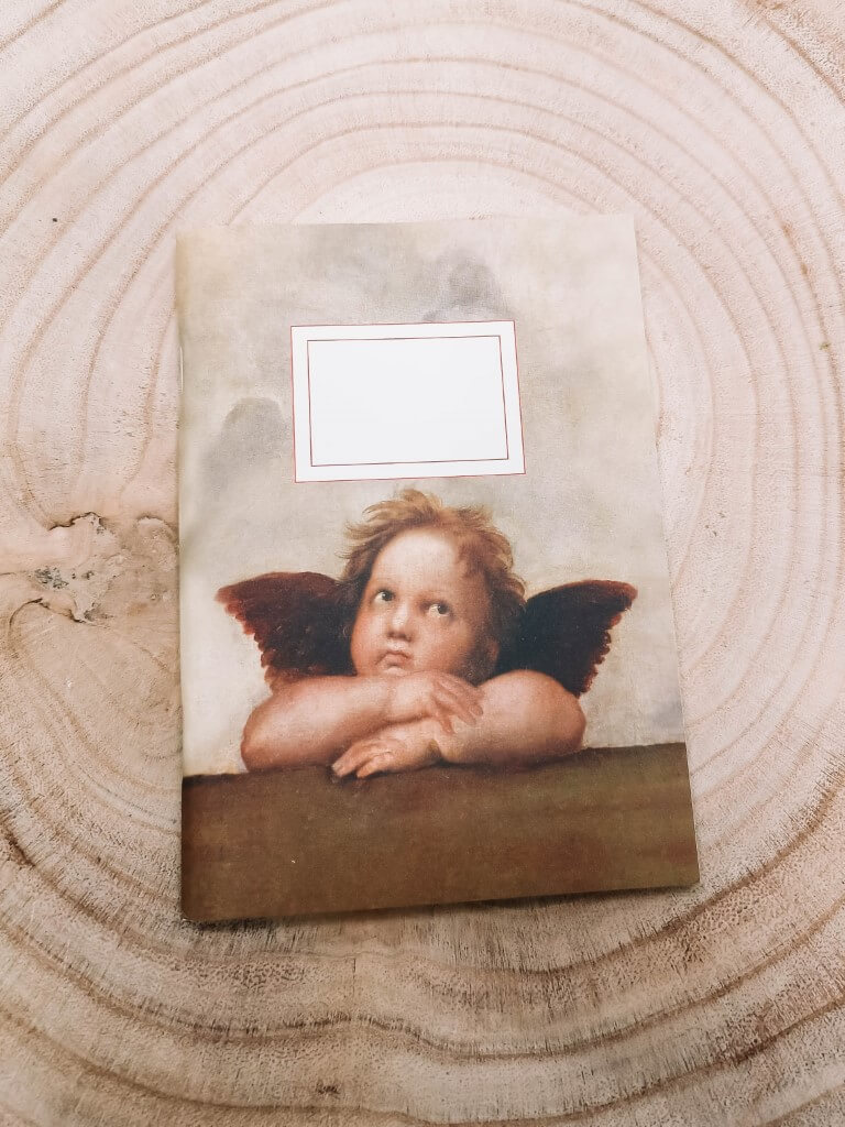 Ongelijnd notitieboekje met een print van Rafaels Engelen van het schilderij Sixtijnse Madonna.