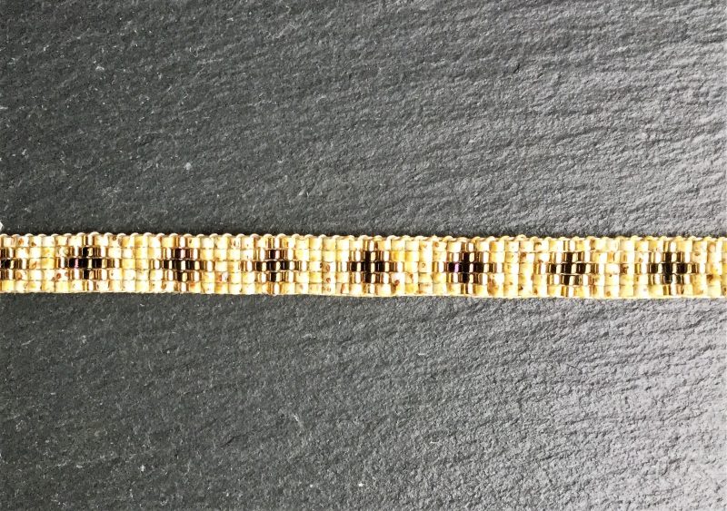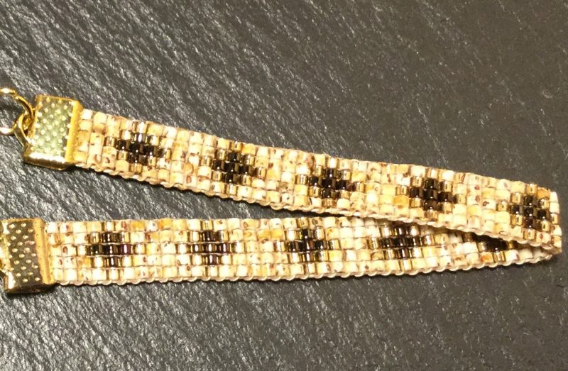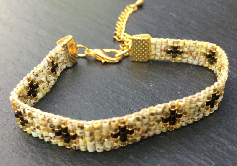 Armband met Miyuki kralen in de mooie kleur picasso yellow. Bruine vierkanten afgewerkt met een goudkleur.