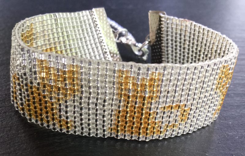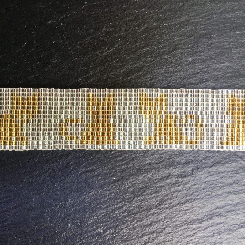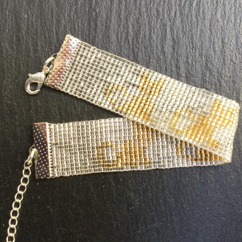 Zilverkleurige handgeweven kralenarmband met 11/0 Miyuki kralen en goudkleurige poesjes. Voor de echte cat lover.