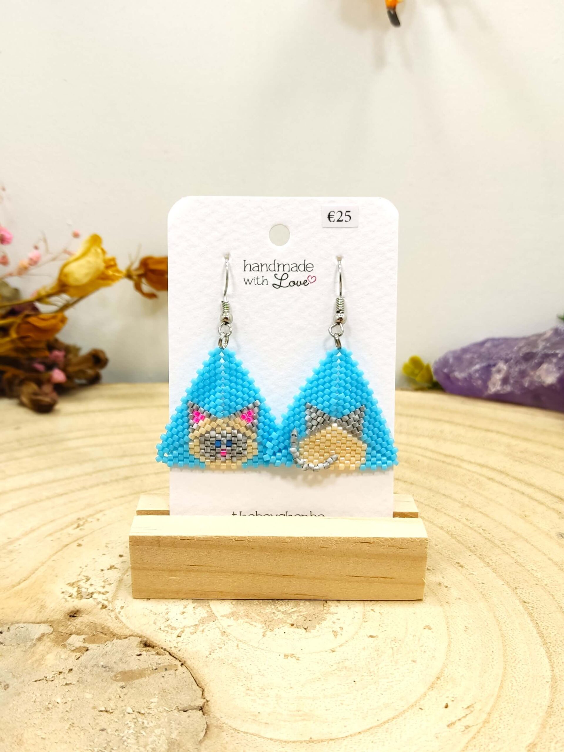 Driehoekige oorhangers beige-grijze kat op blauwe achtergrond. Deze oorhangers zijn volledig handgemaakt met Miyuki kralen 11/0.