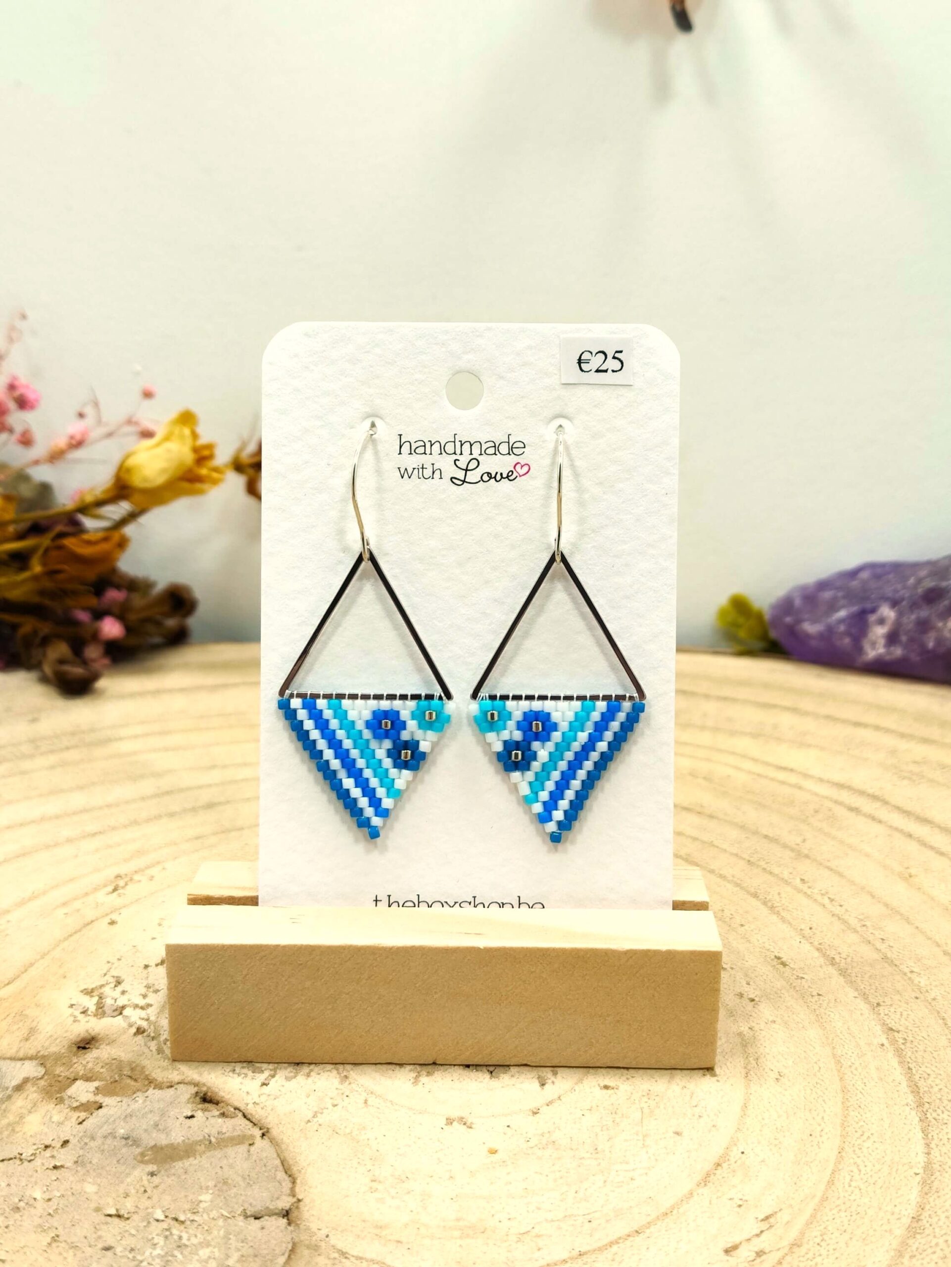 Driehoekige oorhangers met “bloempjes” van Miyuki kralen in verschillende tinten blauw op een witte achtergrond.