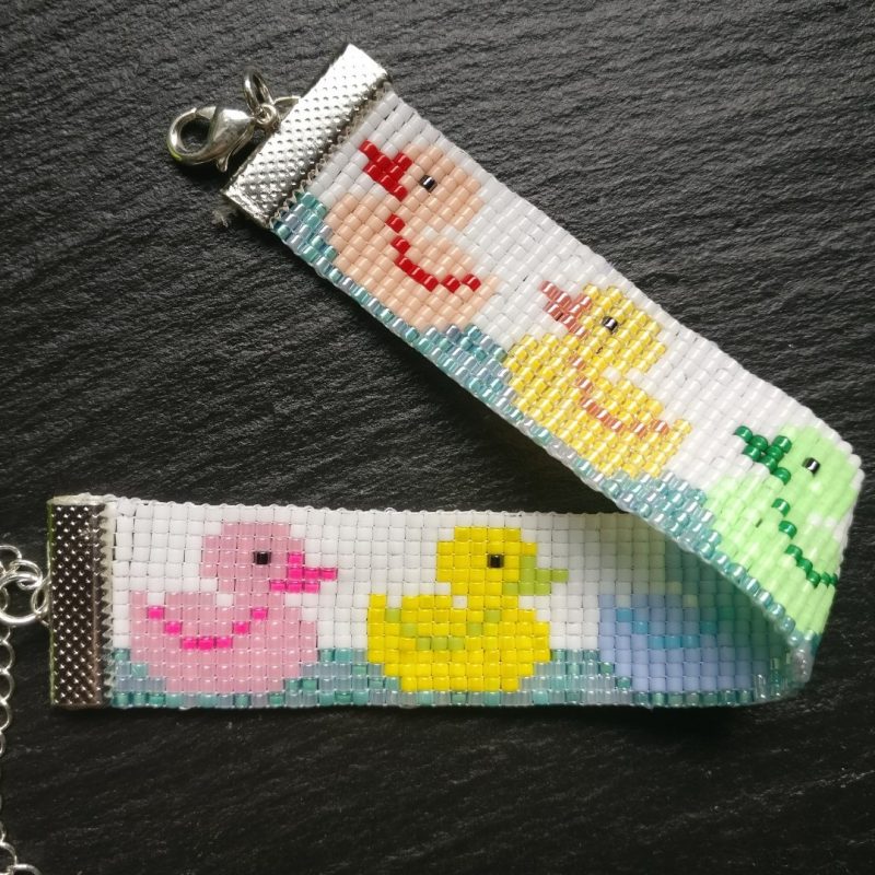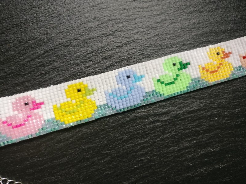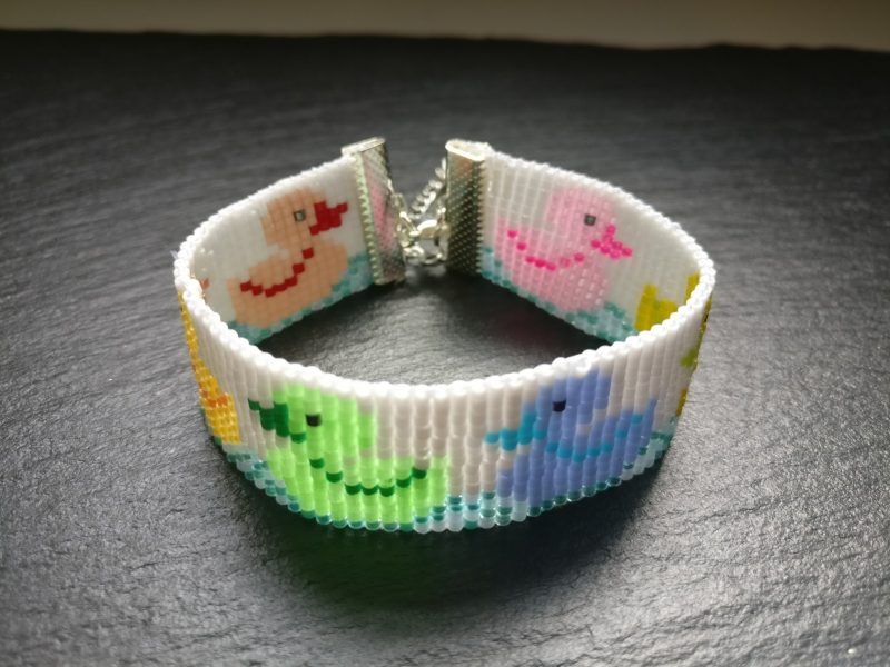 Handgeweven kralenarmband met Miyuki kralen 11/0 en schattige kleurrijke eenden dobberend op het water.