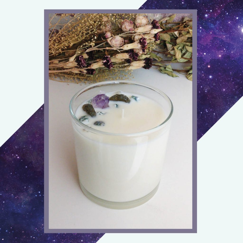 Deze biologische kaars is handgemaakt met natuurlijke koolzaadwas. De was heeft labradoriet, amethist en mosagaat ingebed.