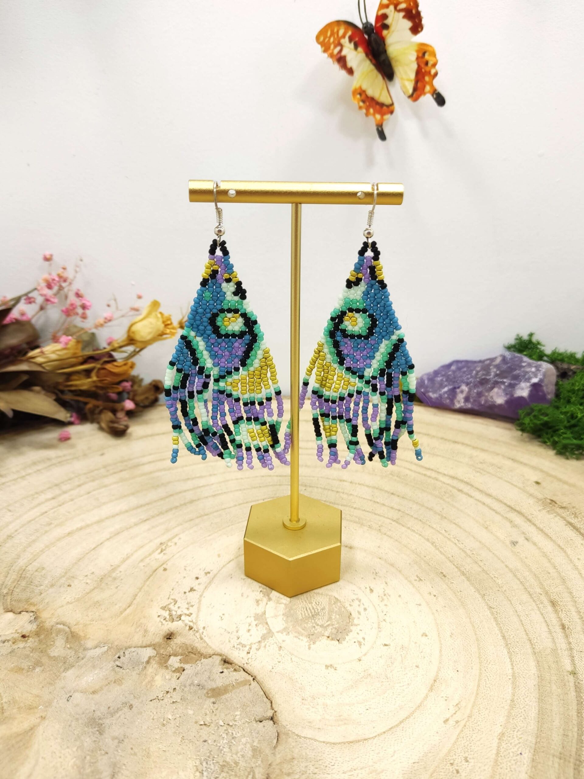 Franje oorhangers in eenmooi abstract patroon. Ronde miyuki kralen in de kleuren paars, geel, groen en blauw.