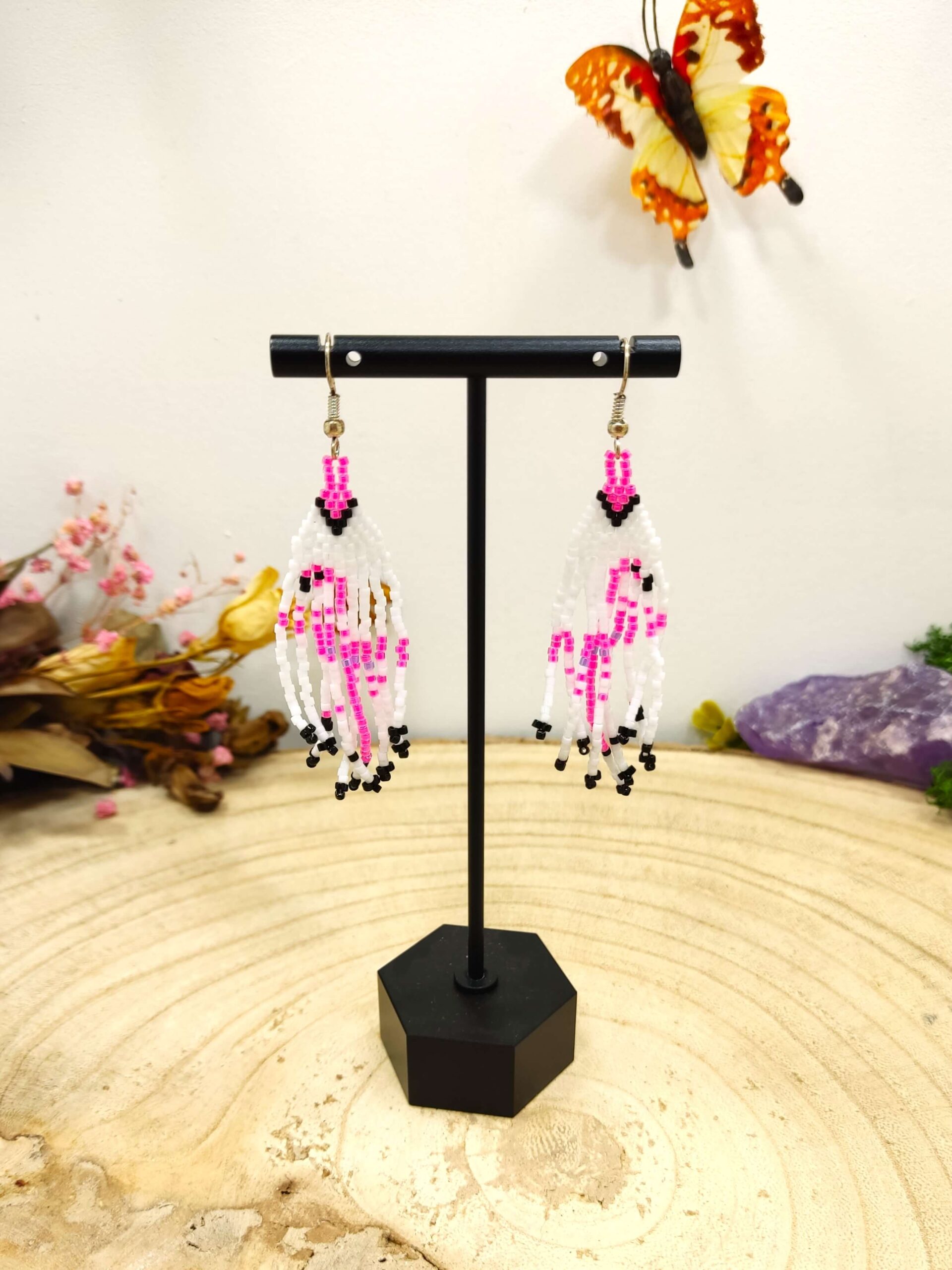 Franje oorhangers van miyuki kraaltjes met roze flamingo op een witte achtergrond. Zeer licht om te dragen.