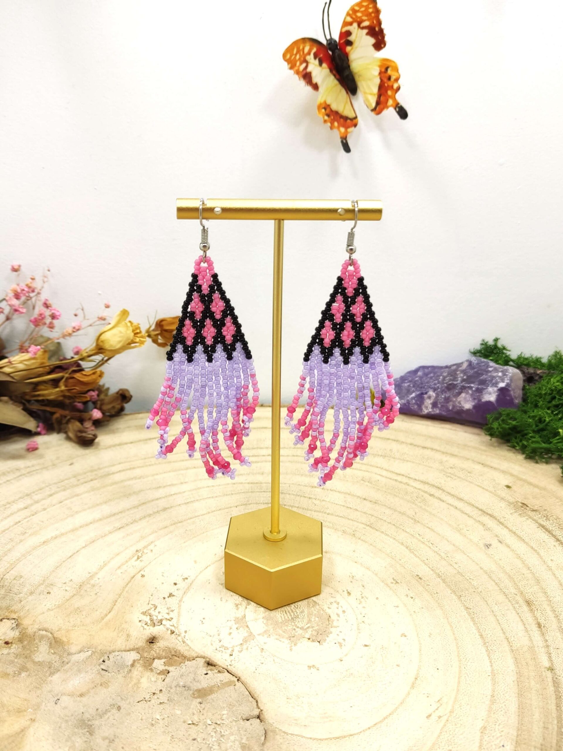 Oorhangers franje in roze, paars en zwart. Bijna onderaan aan elke rij is er een mooie, roze facetkraal bevestigd. De oorhaakjes zijn zilverkleurig.