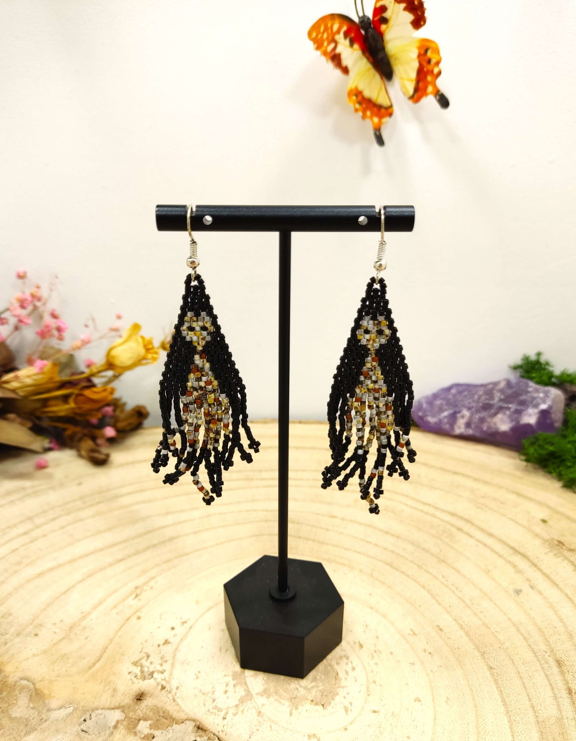Franje oorhangers veelkleurige kat op zwarte achtergrond.