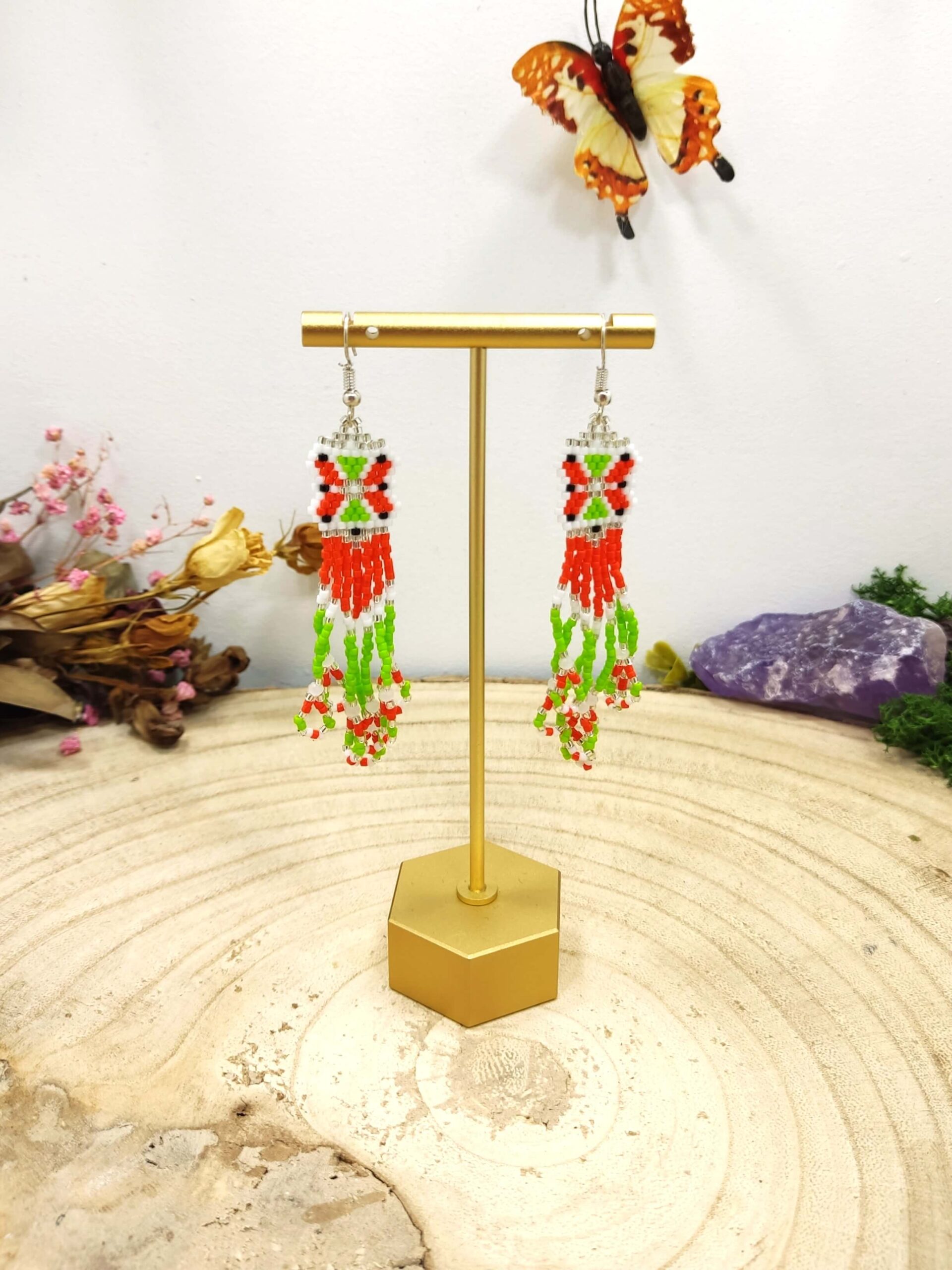 Lange franje oorhangers van Miyuki kralen in een vlinderpatroon met hoofdzakelijk oranje en groene kleuren. De franjes vormen onderaan een lus.