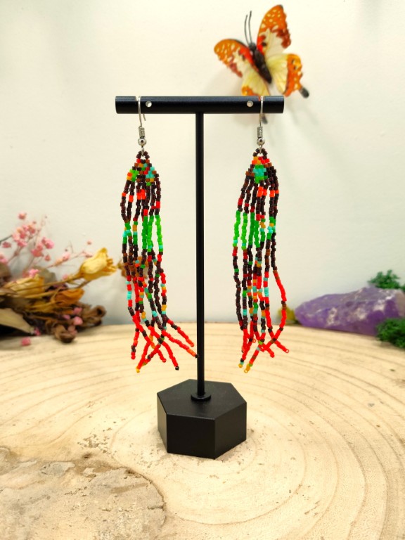 Lange frengels oorhangers met groene, bruine en rode tinten.