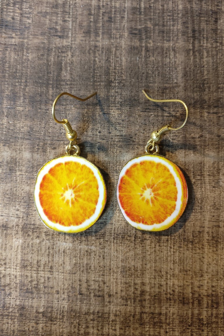 Fijne fruitoorbellen met appelsienen. Goudkleurige afwerking.