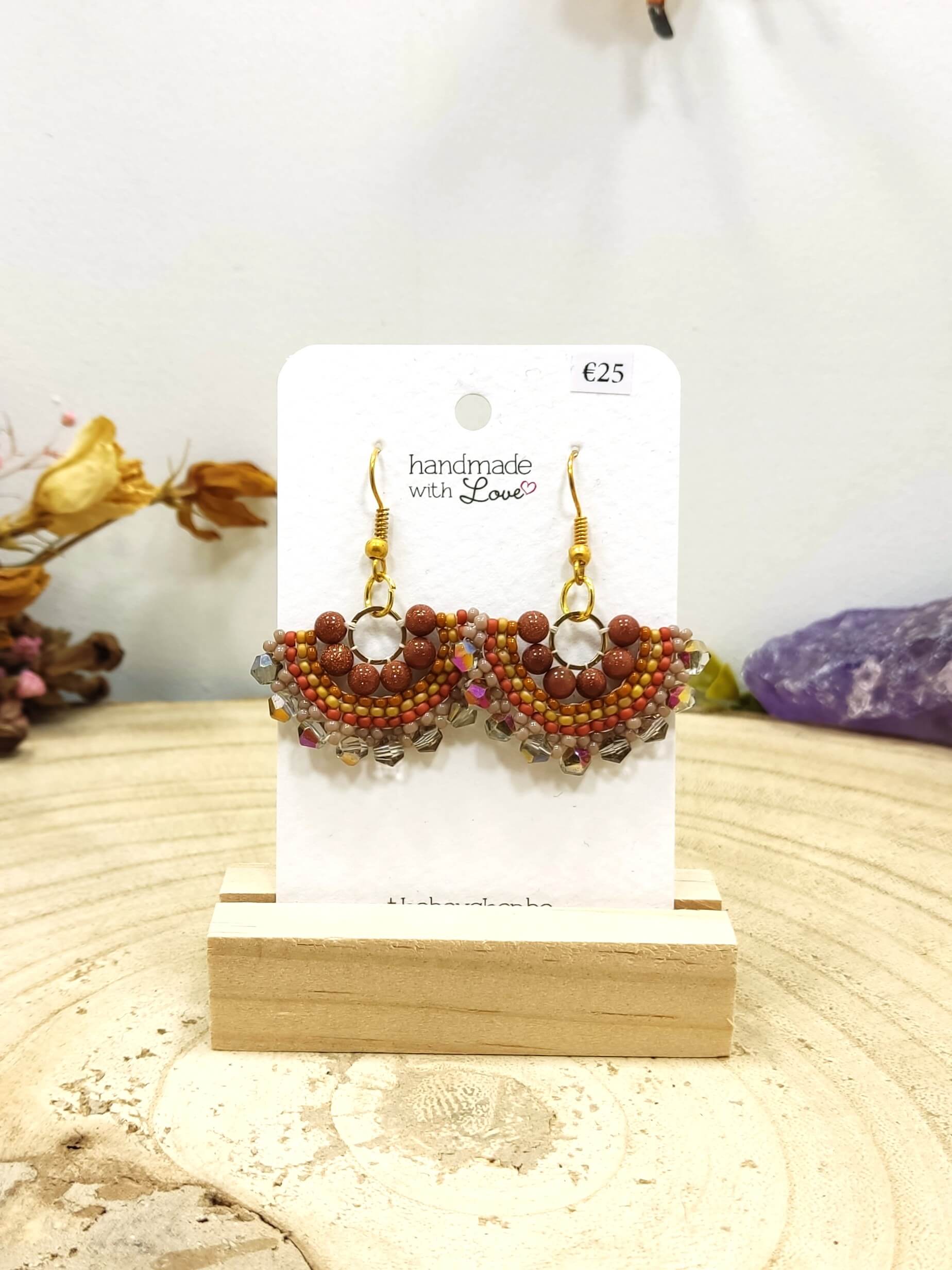 Halfronde oorhangers met bruine gespikkelde parels (sand), miyuki ronde kralen in bruine tinten en facetkralen.