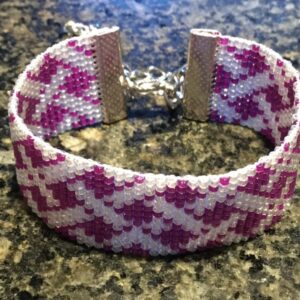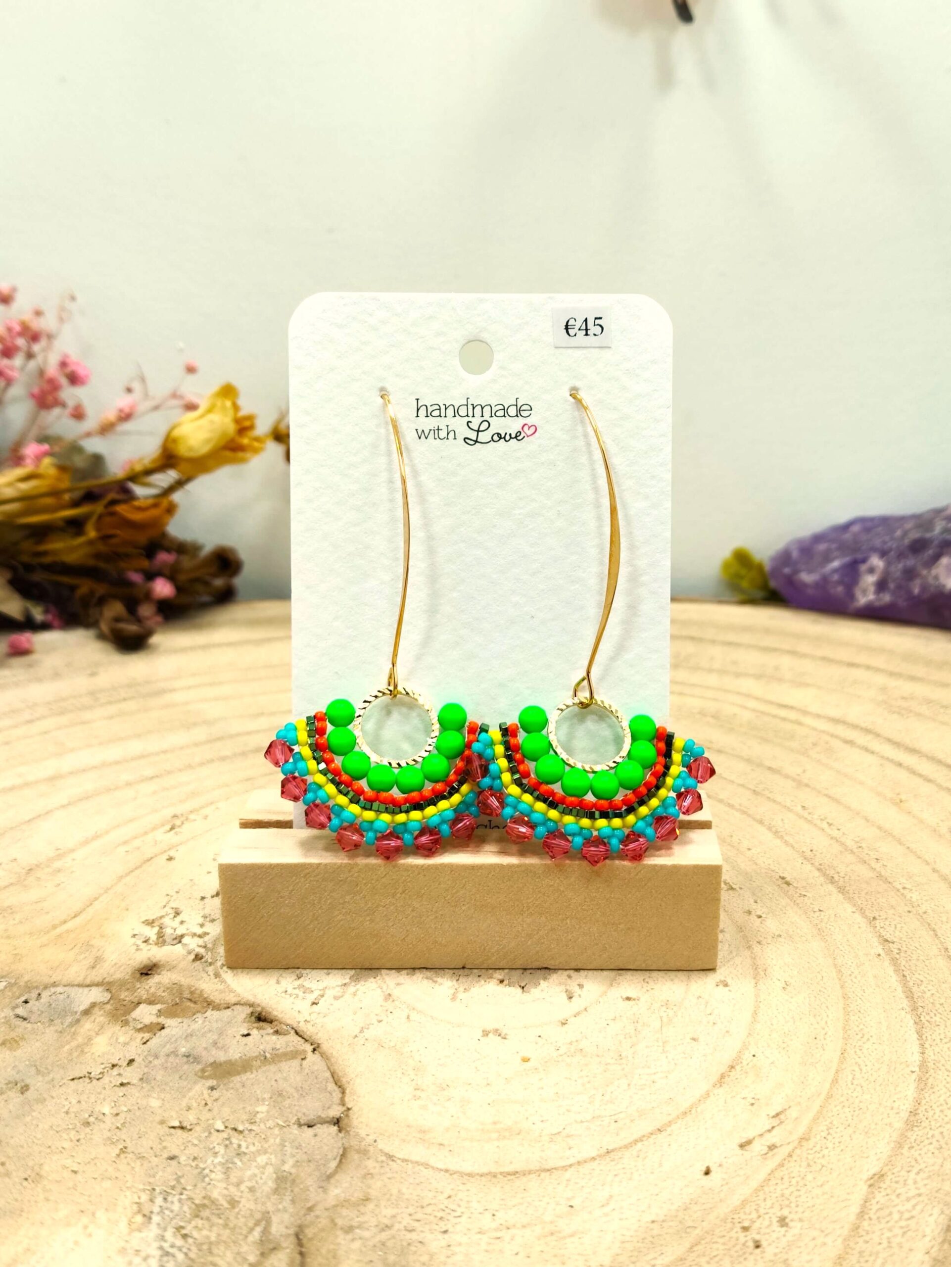 Halfronde oorhangers met groene Swarovski parels en roze facetkralen, Miyuki ronde kralen en hematiet blauw-groene steentjes.