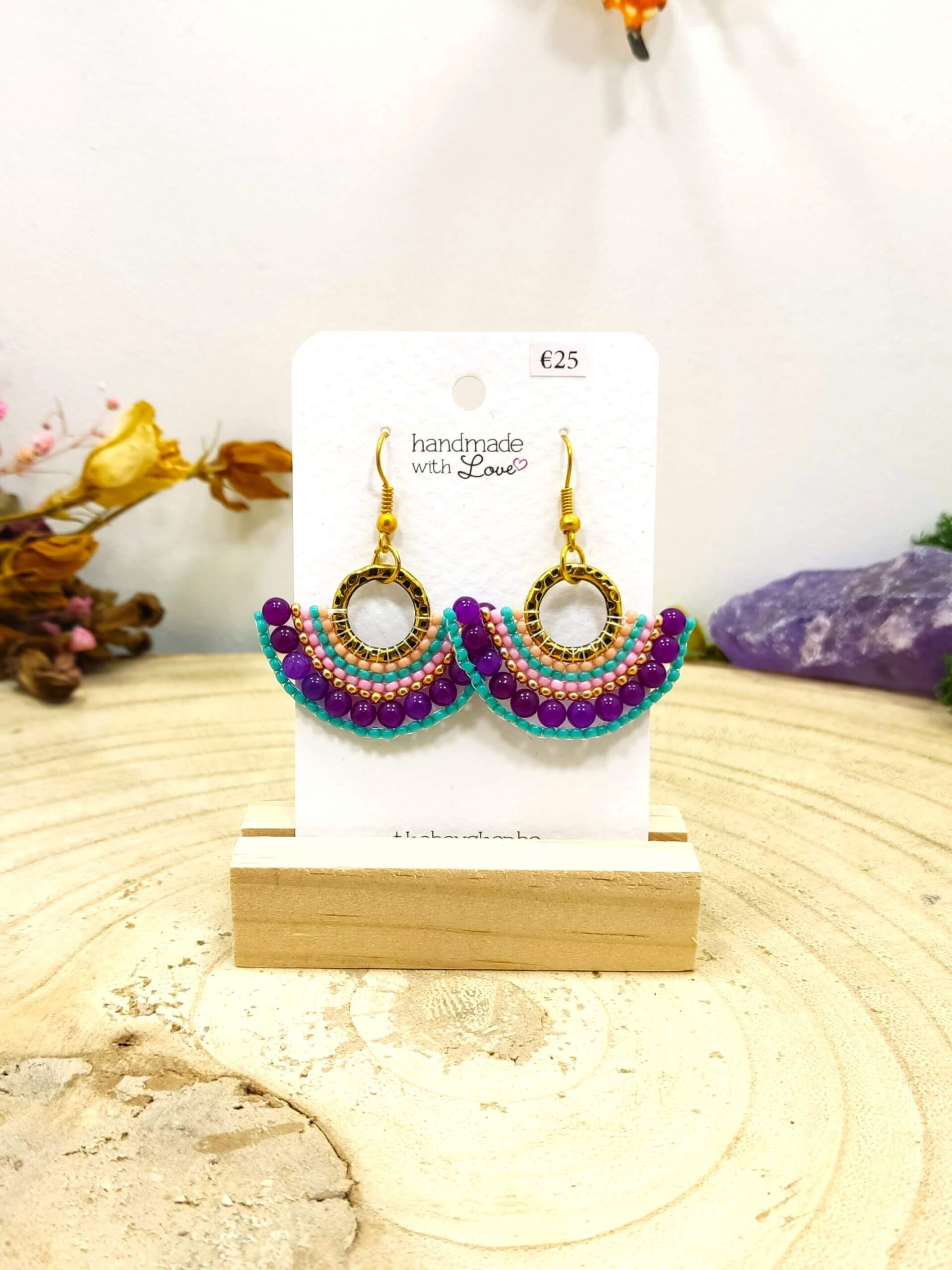 Halfronde oorhangers met paarse parels, miyuki ronde kralen in roze, zalm, groen en galva gold.