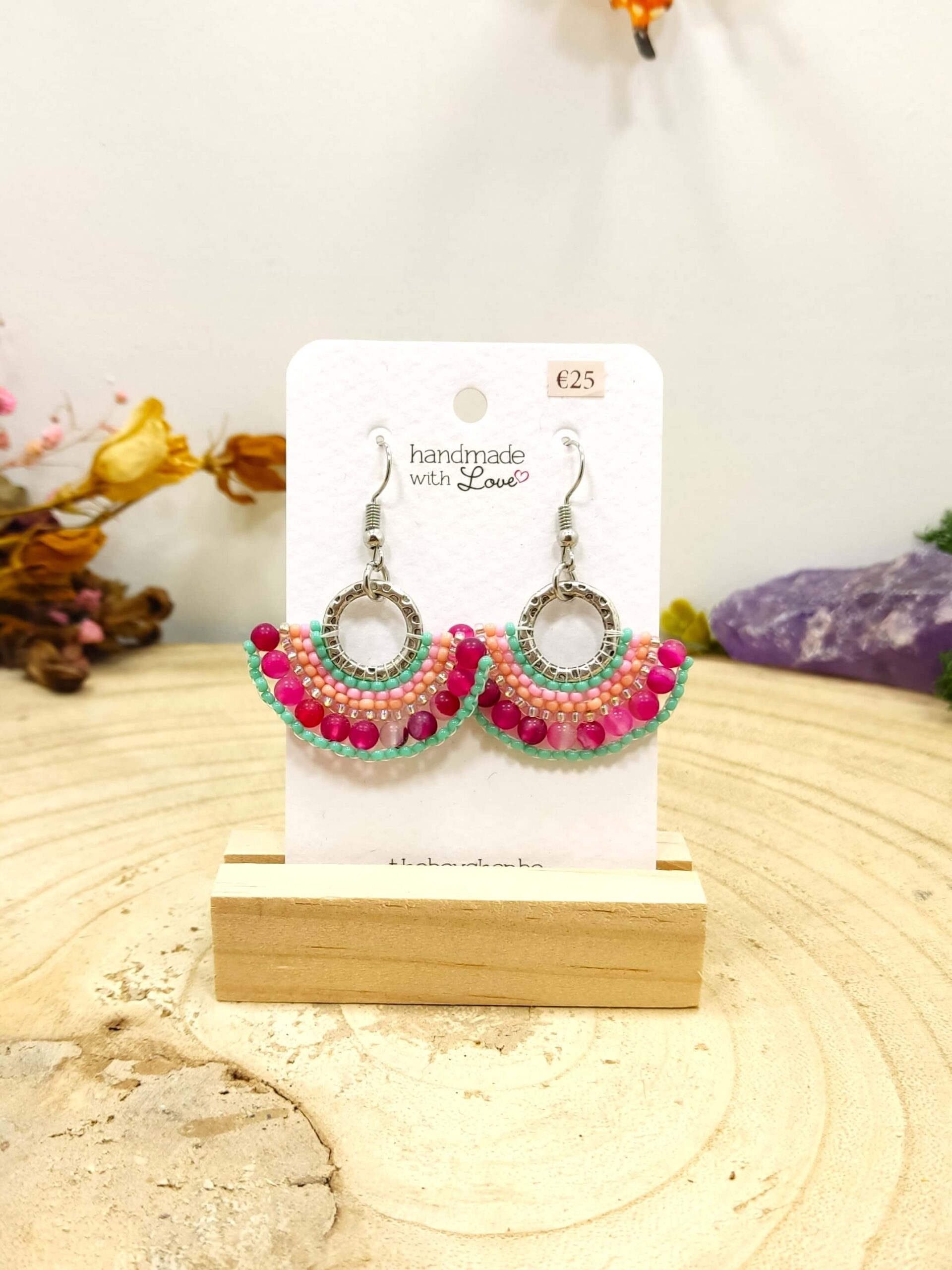 Halfronde oorhangers met rood-roze parels, miyuki ronde kralen in roze, groen en zalmkleur.