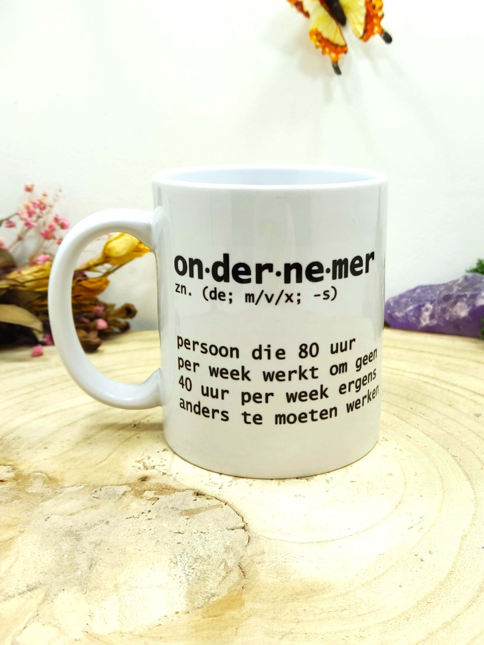 Keramische mok met het opschrift “Ondernemer: persoon die 80 uur per week werk om geen 40 uur per week ergens anders te moeten werken” aan beide kanten.
