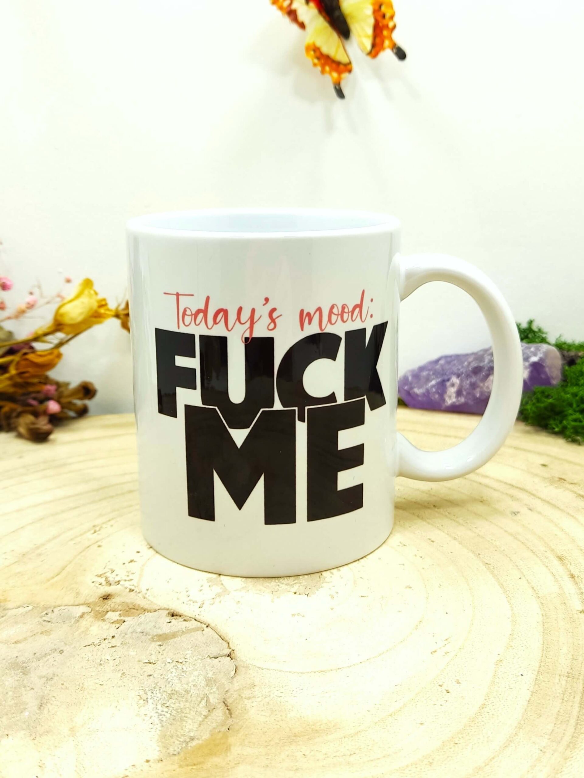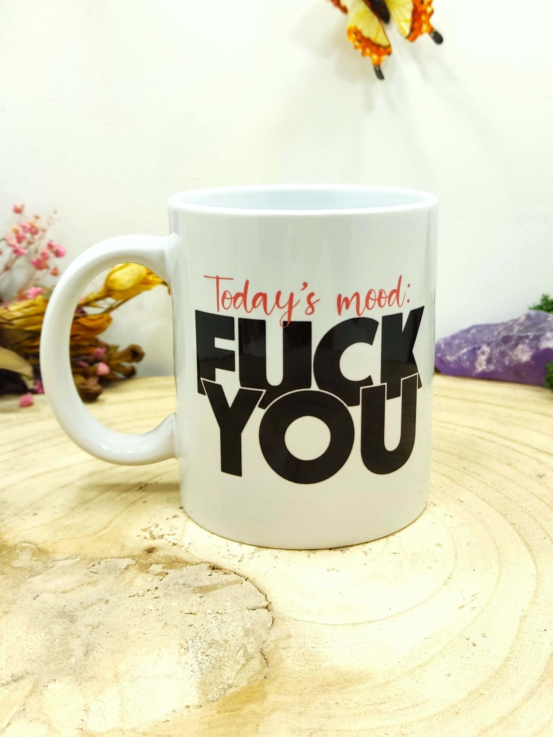 Keramische mok met de opschriften “Today’s mood: Fuck you” aan de ene kant en “Today’s mood: Fuck me” aan de andere kant.