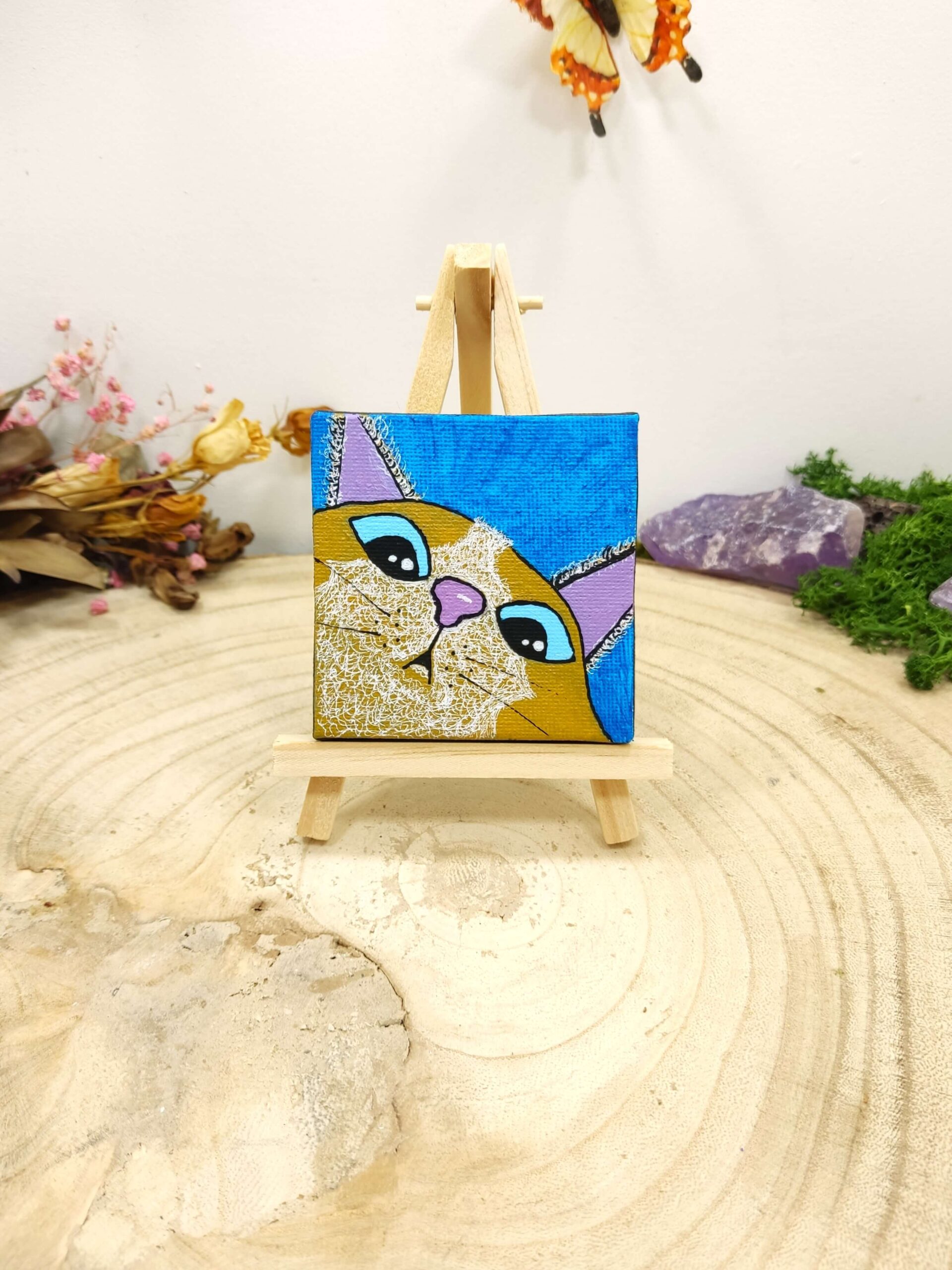 Klein schilderijtje met kat op blauwe achtergrond