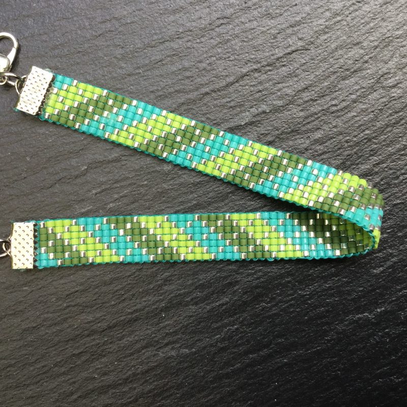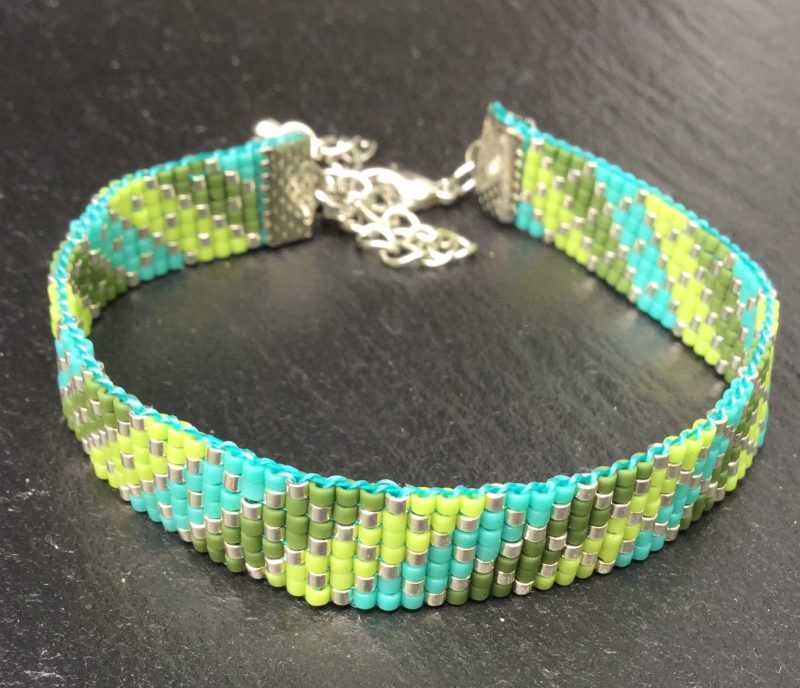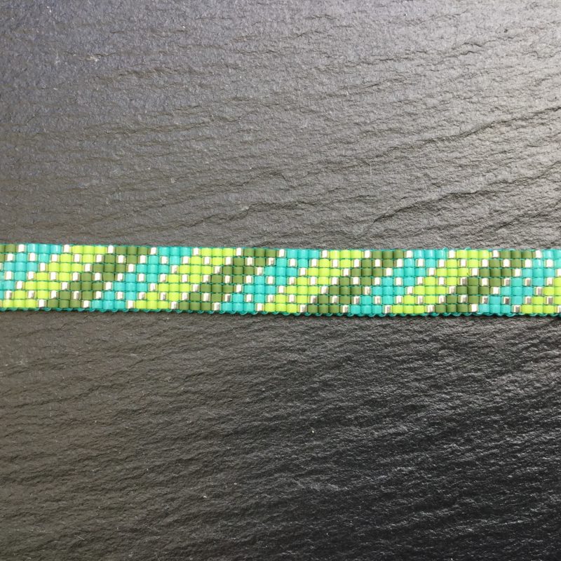 Miyuki armband met een zigzag patroon in 3 tinten blauw -groen en koper.