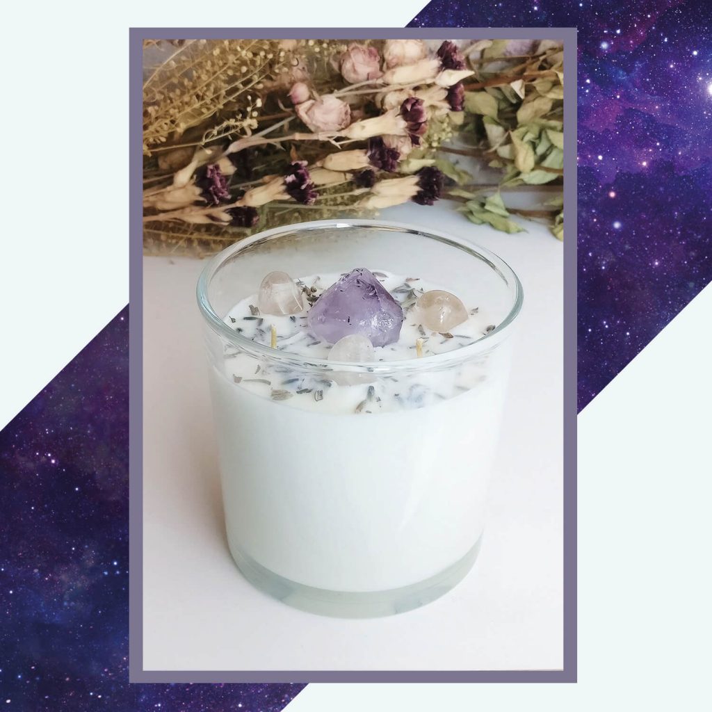 Deze biologische kaars is handgemaakt met natuurlijke koolzaadwas. De was heeft amethist, bergkristal en gedroogde lavendel ingebed. Deze kaars heeft drie lonten in plaats van één.