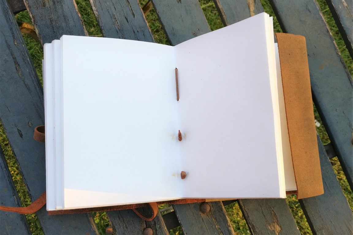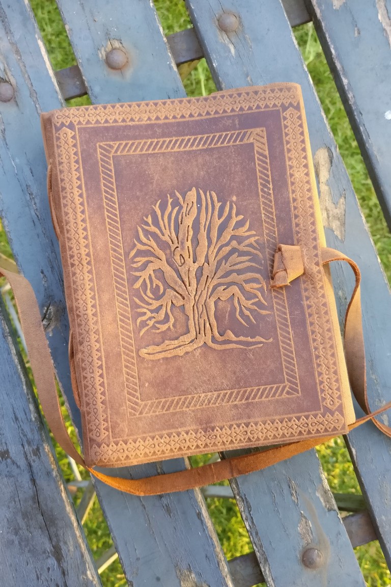 Prachtig handgebonden lederen schrift met handgeschept papier. Op de kaft is een levensboom geëtst.