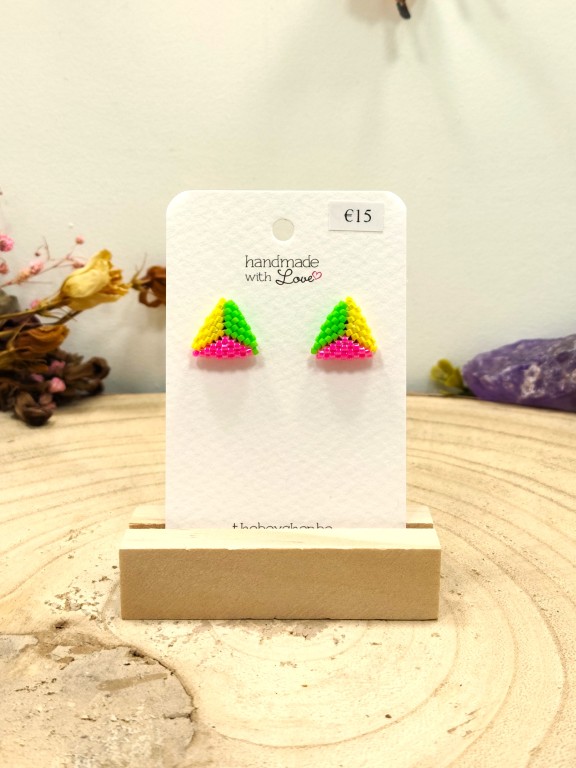 Driehoekige oorstekers van Miyuki kralen in geel, groen en roze.