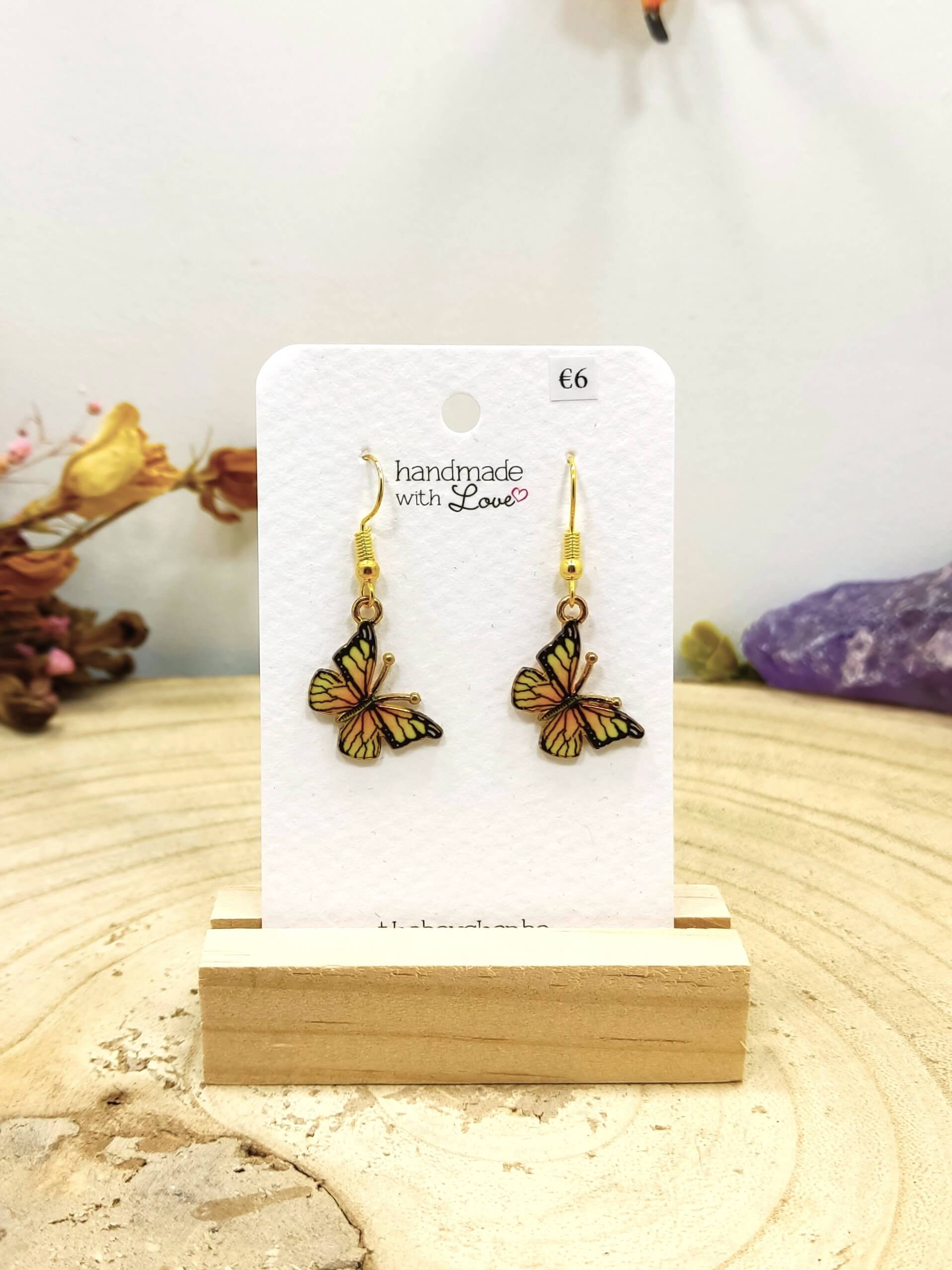 oorhangers gele vlinder in metaal met goudkleurige oorhaken.