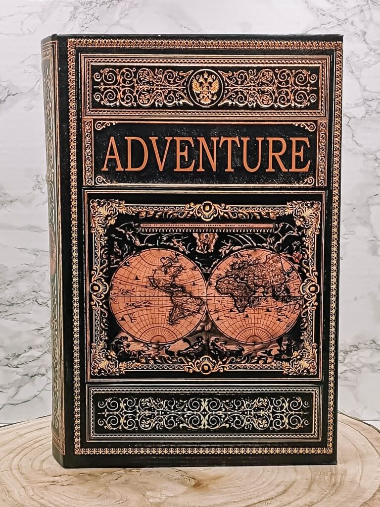 Opbergdoos in boekvorm met een wereldkaart print, met het opschrift “Adventure”. Leuke boekendoos om al je foto’s, brieven, kleine spulletjes… in te bewaren.