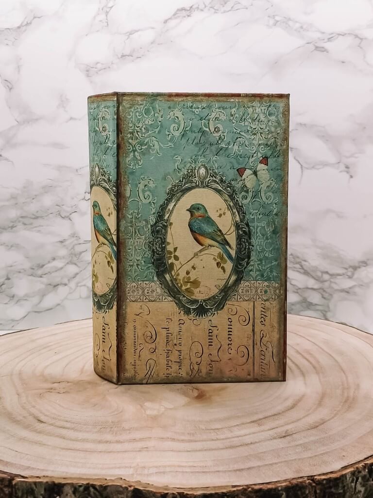 Opbergdoos in boekvorm met een Blauwstaart vogel print. Leuke boekendoos om al je foto’s, brieven, kleine spulletjes… in te bewaren.