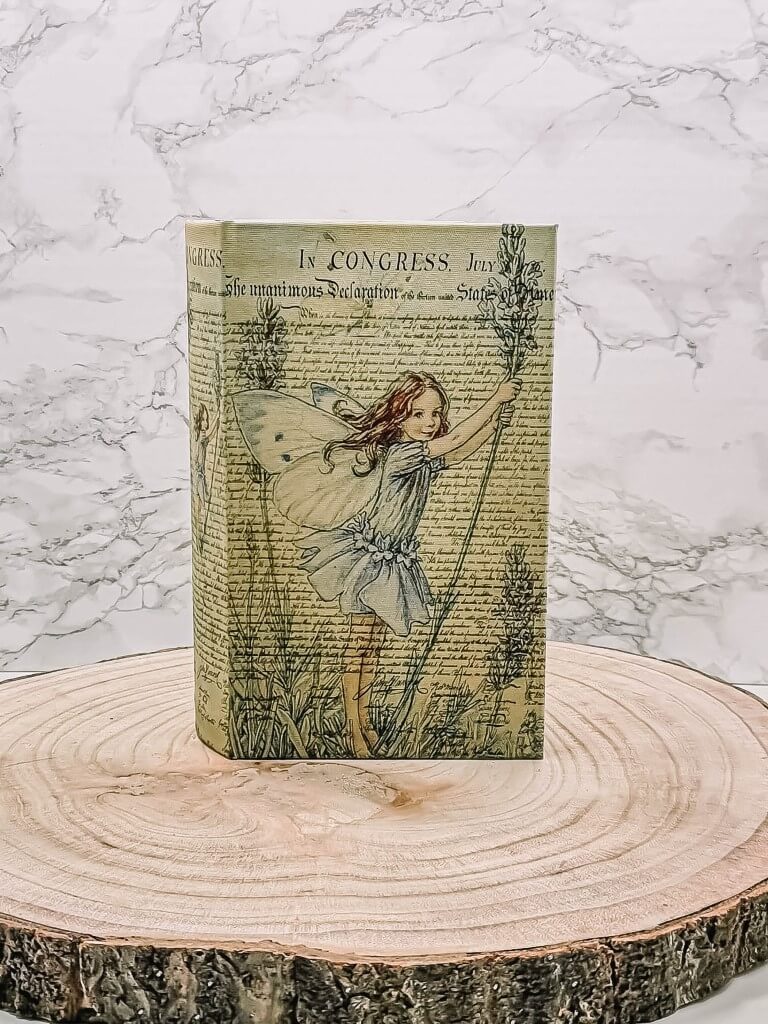 Opbergdoos in boekvorm met een lavendel Flower fairy print. Leuke boekendoos om al je foto’s, brieven, kleine spulletjes… in te bewaren.