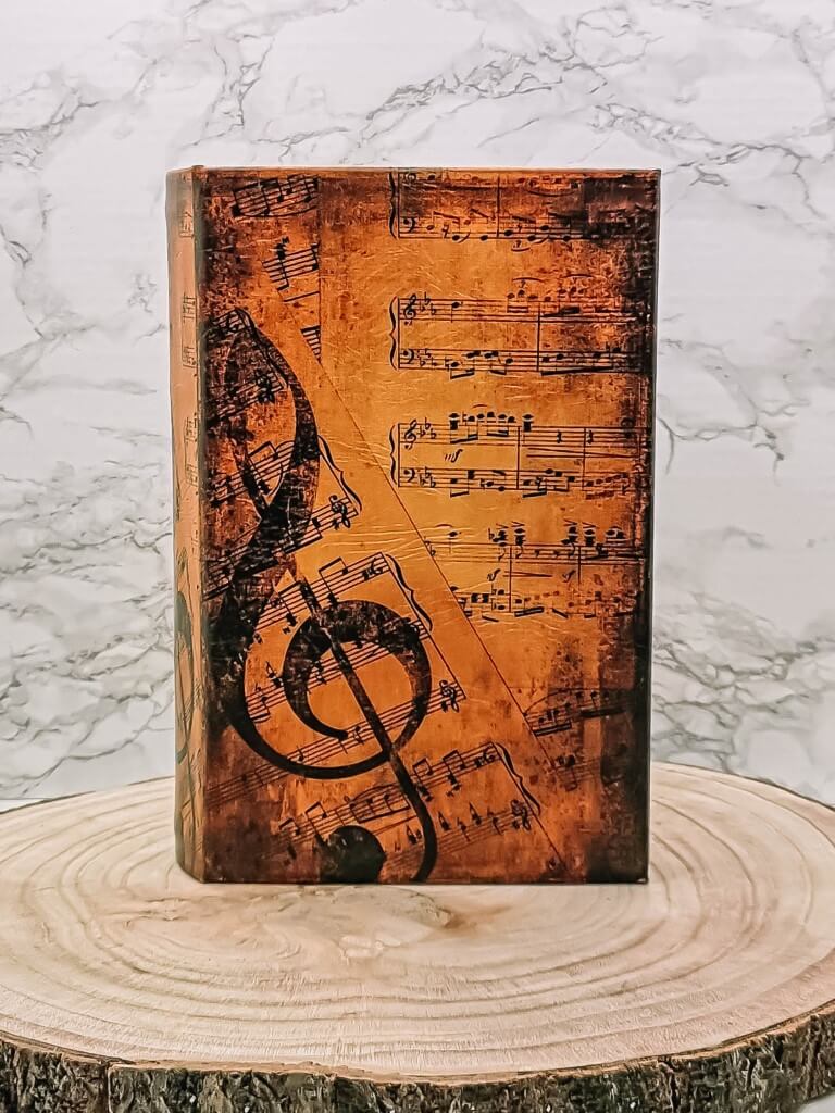 Opbergdoos in boekvorm met een muziek print. Leuke boekendoos om al je foto’s, brieven, kleine spulletjes… in te bewaren.