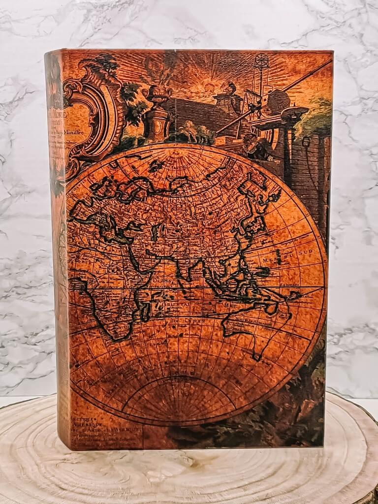 Opbergdoos in boekvorm met een oude wereldkaart print. Leuke boekendoos om al je foto’s, brieven, kleine spulletjes… in te bewaren.
