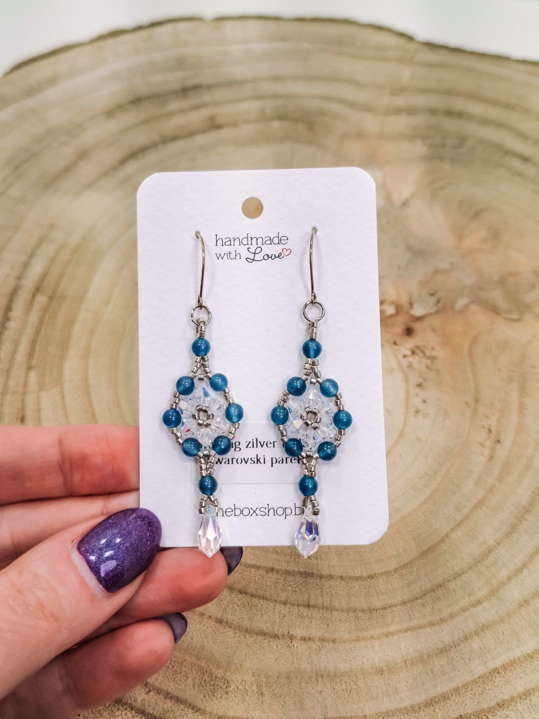Materiaal: sterling zilver (925) oorhaken, miyuki galvanised silver, blauwe glasparels en Swarovski crystals