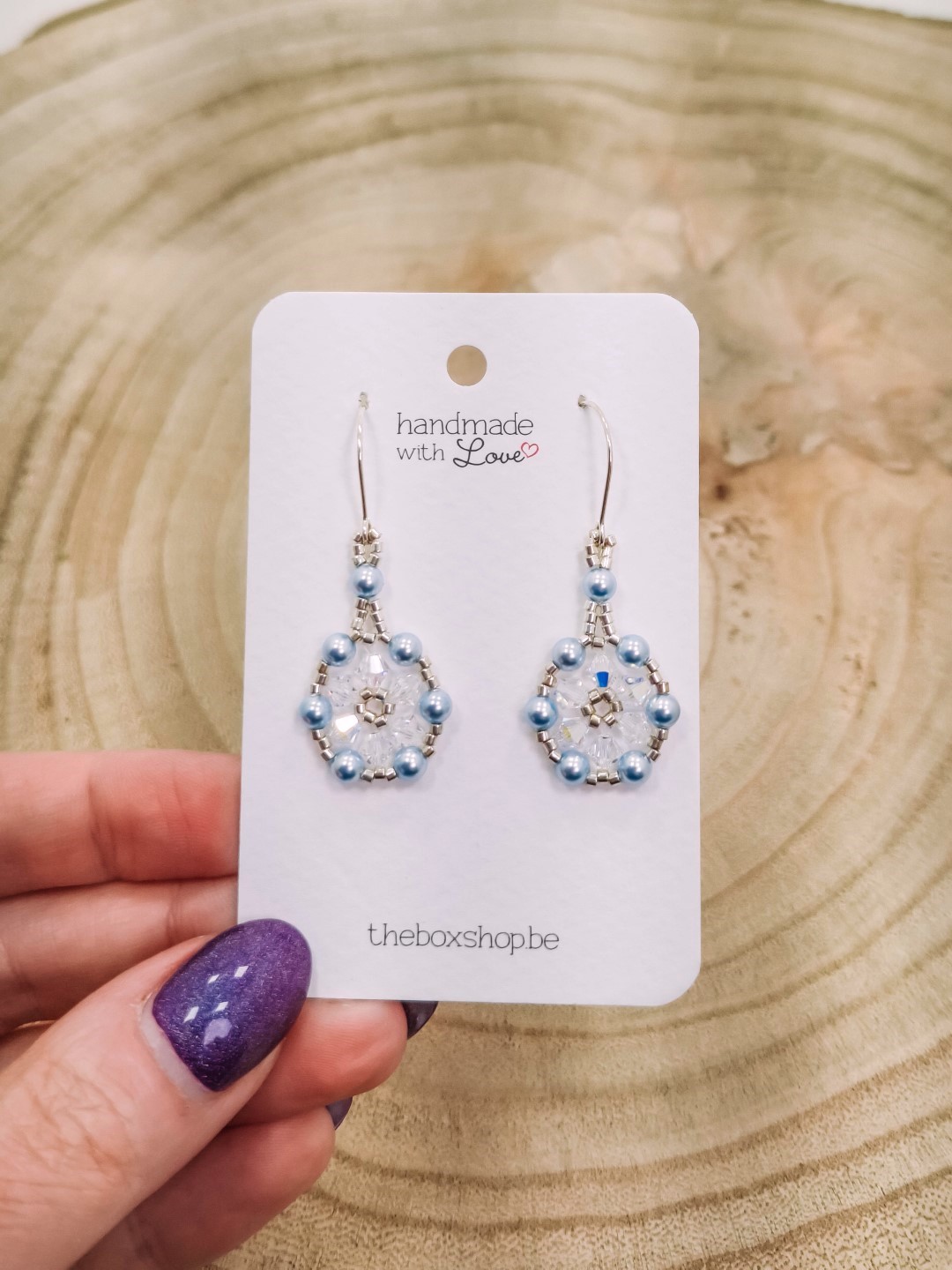 Materiaal: sterling zilver (925) oorhaken, zilveren miyuki, Swarovski pearls en Swarovski crystals