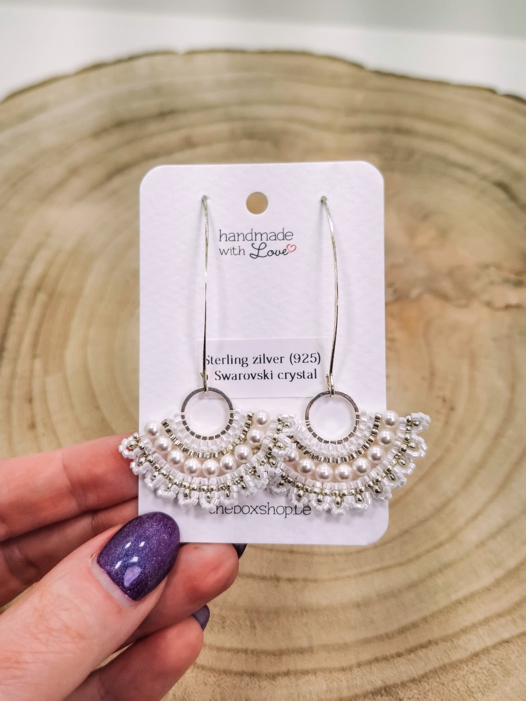 Materiaal: sterling zilver (925) oorhaken, miyuki rocailles galvanised silver, miyuki DB galvanised silver en Swarovski white pearls