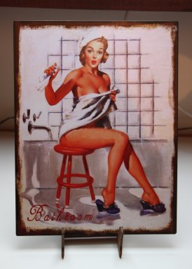 Tinnen plaat met badkamerprint met pin up meisje.