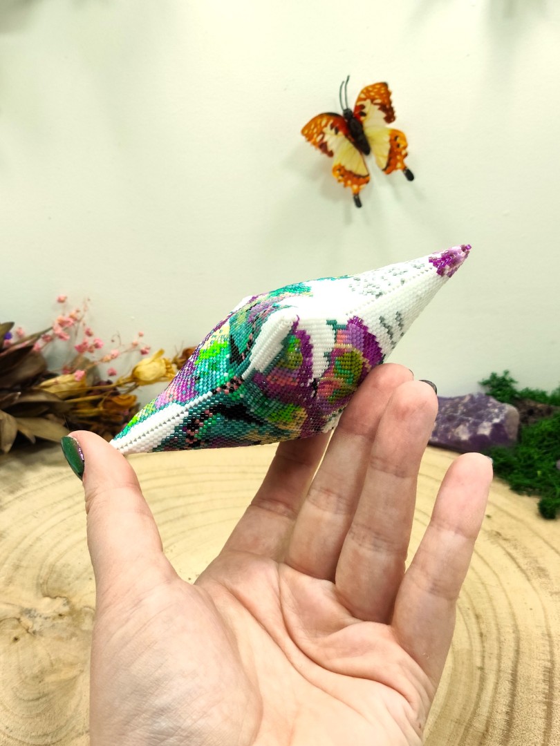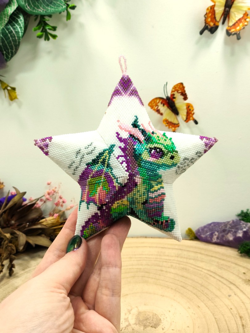 Hou je van draken en fleur je graag jouw ruimte op met een prachtig en uniek decoratiestuk? Deze ster is handgeweven met Miyuki seed beads, dat zijn mini glasparels van 1,6 millimeter groot. Een werk van lange adem om deze mooie draak meticuleus in het juiste patroon te weven en er deze prachtige decoratiester van te maken.