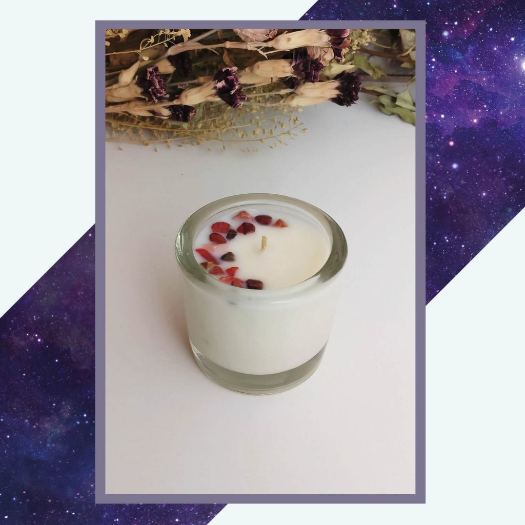 Deze biologische kaars is handgemaakt met natuurlijke koolzaadwas. De was heeft rode agaat chips ingebed.