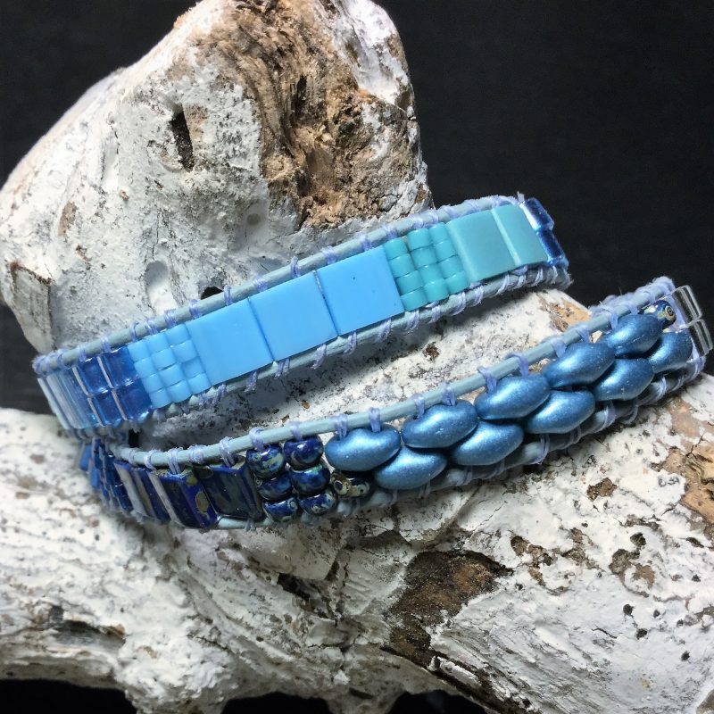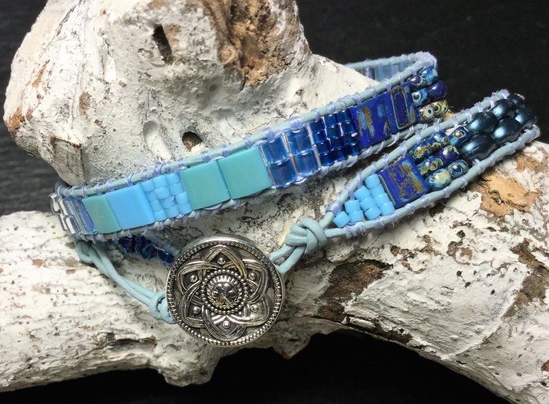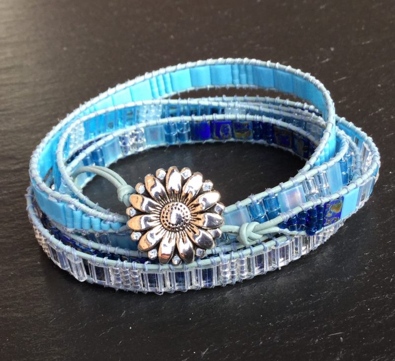 Deze blauwe-turquoise lederen wraparmband is gemaakt met de mooie Tila beads in de kleuren opaque cobalt, turquoise blue en green. Verder zijn er Miyuki 11/0 kralen in verwerkt in de kleuren ocean blue, cobalt, light aqua, green turquoise en blue turquoise. De Miuyki 8/0 kralen zijn er in de kleuren chrystal, sparkling blue en opaque picasso blue. Er zijn ook superduo’s in geweven in 2 tinten blauw. De armband heeft drie lussluitingen en wordt gesloten door een mooie bloemknoop.